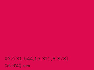 XYZ 31.644,16.311,8.878 Color is a normal rose color and the nearest color is Debian Red #d70a53. Hex code #de0a4f and RGB value is rgb(222,10,79). In RGB color space, this color is composed of 87% red, 4% green, 31% blue, In CMYK color space, this color is composed of 0% cyan, 95% magenta, 64% yellow , 13% black , In HSL color space, this color has a hue angle of 340° , 91% saturation and 45% lightness.