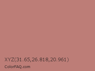 XYZ 31.65,26.818,20.961 Color is a normal red color and the nearest color is Old Rose #c08081. Hex code #bd7d77 and RGB value is rgb(189,125,119). In RGB color space, this color is composed of 74% red, 49% green, 47% blue, In CMYK color space, this color is composed of 0% cyan, 34% magenta, 37% yellow , 26% black , In HSL color space, this color has a hue angle of 5° , 35% saturation and 60% lightness.