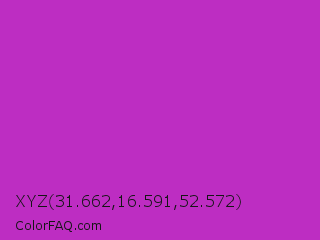 XYZ 31.662,16.591,52.572 Color is a normal magenta color and the nearest color is Steel Pink #cc33cc. Hex code #bd2dc2 and RGB value is rgb(189,45,194). In RGB color space, this color is composed of 74% red, 18% green, 76% blue, In CMYK color space, this color is composed of 3% cyan, 77% magenta, 0% yellow , 24% black , In HSL color space, this color has a hue angle of 298° , 62% saturation and 47% lightness.