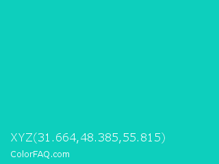 XYZ 31.664,48.385,55.815 Color is a normal cyan color and the nearest color is Robins Egg Blue #00cccc. Hex code #0dcfbd and RGB value is rgb(13,207,189). In RGB color space, this color is composed of 5% red, 81% green, 74% blue, In CMYK color space, this color is composed of 94% cyan, 0% magenta, 9% yellow , 19% black , In HSL color space, this color has a hue angle of 174° , 88% saturation and 43% lightness.