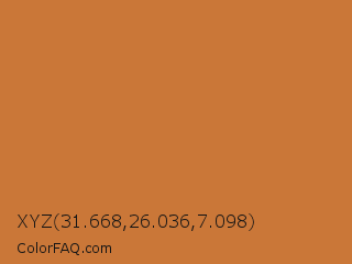 XYZ 31.668,26.036,7.098 Color is a normal orange color and the nearest color is Bronze #cd7f32. Hex code #ca7738 and RGB value is rgb(202,119,56). In RGB color space, this color is composed of 79% red, 47% green, 22% blue, In CMYK color space, this color is composed of 0% cyan, 41% magenta, 72% yellow , 21% black , In HSL color space, this color has a hue angle of 26° , 58% saturation and 51% lightness.