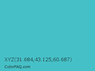 XYZ 31.684,43.125,60.687 Color is a normal cyan color and the nearest color is Sea Serpent #4bc7cf. Hex code #46c0c7 and RGB value is rgb(70,192,199). In RGB color space, this color is composed of 27% red, 75% green, 78% blue, In CMYK color space, this color is composed of 65% cyan, 4% magenta, 0% yellow , 22% black , In HSL color space, this color has a hue angle of 183° , 54% saturation and 53% lightness.