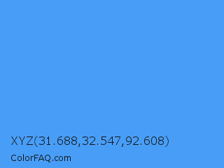 XYZ 31.688,32.547,92.608 Color is a light blue color and the nearest color is Brilliant Azure #3399ff. Hex code #489ef7 and RGB value is rgb(72,158,247). In RGB color space, this color is composed of 28% red, 62% green, 97% blue, In CMYK color space, this color is composed of 71% cyan, 36% magenta, 0% yellow , 3% black , In HSL color space, this color has a hue angle of 211° , 92% saturation and 63% lightness.