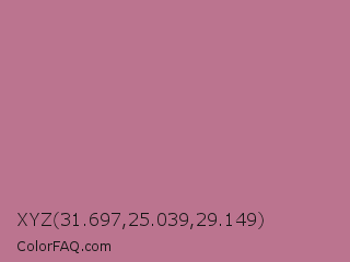 XYZ 31.697,25.039,29.149 Color is a normal rose color and the nearest color is Turkish Rose #b57281. Hex code #bb748f and RGB value is rgb(187,116,143). In RGB color space, this color is composed of 73% red, 45% green, 56% blue, In CMYK color space, this color is composed of 0% cyan, 38% magenta, 24% yellow , 27% black , In HSL color space, this color has a hue angle of 337° , 34% saturation and 59% lightness.