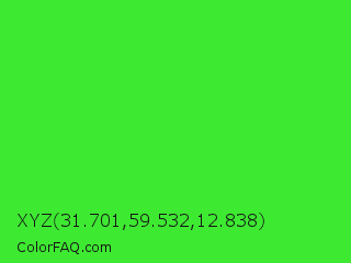 XYZ 31.701,59.532,12.838 Color is a normal green color and the nearest color is Lime Green #32cd32. Hex code #3ee932 and RGB value is rgb(62,233,50). In RGB color space, this color is composed of 24% red, 91% green, 20% blue, In CMYK color space, this color is composed of 73% cyan, 0% magenta, 79% yellow , 9% black , In HSL color space, this color has a hue angle of 116° , 81% saturation and 55% lightness.
