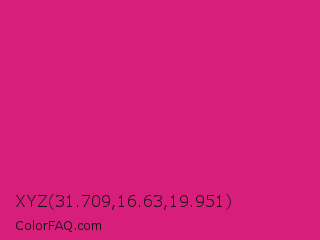 XYZ 31.709,16.63,19.951 Color is a normal rose color and the nearest color is Vivid Cerise #da1d81. Hex code #d61e7a and RGB value is rgb(214,30,122). In RGB color space, this color is composed of 84% red, 12% green, 48% blue, In CMYK color space, this color is composed of 0% cyan, 86% magenta, 43% yellow , 16% black , In HSL color space, this color has a hue angle of 330° , 75% saturation and 48% lightness.