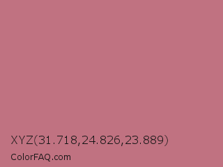 XYZ 31.718,24.826,23.889 Color is a normal red color and the nearest color is Turkish Rose #b57281. Hex code #c07281 and RGB value is rgb(192,114,129). In RGB color space, this color is composed of 75% red, 45% green, 51% blue, In CMYK color space, this color is composed of 0% cyan, 41% magenta, 33% yellow , 25% black , In HSL color space, this color has a hue angle of 348° , 38% saturation and 60% lightness.