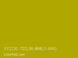 XYZ 31.723,36.868,5.444 Color is a normal yellow color and the nearest color is Buddha Gold #c1a004. Hex code #b0a700 and RGB value is rgb(176,167,0). In RGB color space, this color is composed of 69% red, 65% green, 0% blue, In CMYK color space, this color is composed of 0% cyan, 5% magenta, 100% yellow , 31% black , In HSL color space, this color has a hue angle of 57° , 100% saturation and 35% lightness.