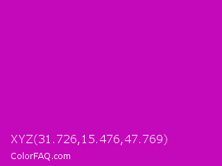 XYZ 31.726,15.476,47.769 Color is a normal magenta color and the nearest color is Deep Magenta #cc00cc. Hex code #c409ba and RGB value is rgb(196,9,186). In RGB color space, this color is composed of 77% red, 4% green, 73% blue, In CMYK color space, this color is composed of 0% cyan, 95% magenta, 5% yellow , 23% black , In HSL color space, this color has a hue angle of 303° , 91% saturation and 40% lightness.
