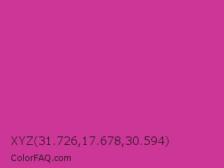 XYZ 31.726,17.678,30.594 Color is a normal magenta color and the nearest color is Royal Fuchsia #ca2c92. Hex code #cc3696 and RGB value is rgb(204,54,150). In RGB color space, this color is composed of 80% red, 21% green, 59% blue, In CMYK color space, this color is composed of 0% cyan, 74% magenta, 26% yellow , 20% black , In HSL color space, this color has a hue angle of 322° , 60% saturation and 51% lightness.