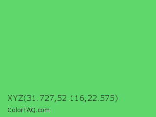 XYZ 31.727,52.116,22.575 Color is a light green color and the nearest color is Emerald #50c878. Hex code #5fd76c and RGB value is rgb(95,215,108). In RGB color space, this color is composed of 37% red, 84% green, 42% blue, In CMYK color space, this color is composed of 56% cyan, 0% magenta, 50% yellow , 16% black , In HSL color space, this color has a hue angle of 127° , 60% saturation and 61% lightness.