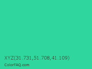 XYZ 31.731,51.708,41.109 Color is a normal green color and the nearest color is Shamrock #33cc99. Hex code #2fd79f and RGB value is rgb(47,215,159). In RGB color space, this color is composed of 18% red, 84% green, 62% blue, In CMYK color space, this color is composed of 78% cyan, 0% magenta, 26% yellow , 16% black , In HSL color space, this color has a hue angle of 160° , 68% saturation and 51% lightness.