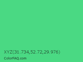XYZ 31.734,52.72,29.976 Color is a normal green color and the nearest color is Emerald #50c878. Hex code #4ad983 and RGB value is rgb(74,217,131). In RGB color space, this color is composed of 29% red, 85% green, 51% blue, In CMYK color space, this color is composed of 66% cyan, 0% magenta, 40% yellow , 15% black , In HSL color space, this color has a hue angle of 144° , 65% saturation and 57% lightness.