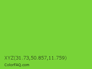 XYZ 31.73,50.857,11.759 Color is a normal green color and the nearest color is Kiwi #8ee53f. Hex code #78d337 and RGB value is rgb(120,211,55). In RGB color space, this color is composed of 47% red, 83% green, 22% blue, In CMYK color space, this color is composed of 43% cyan, 0% magenta, 74% yellow , 17% black , In HSL color space, this color has a hue angle of 95° , 64% saturation and 52% lightness.