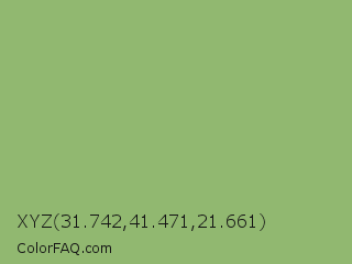 XYZ 31.742,41.471,21.661 Color is a normal green color and the nearest color is Olivine #9ab973. Hex code #91b870 and RGB value is rgb(145,184,112). In RGB color space, this color is composed of 57% red, 72% green, 44% blue, In CMYK color space, this color is composed of 21% cyan, 0% magenta, 39% yellow , 28% black , In HSL color space, this color has a hue angle of 93° , 34% saturation and 58% lightness.