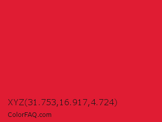 XYZ 31.753,16.917,4.724 Color is a normal red color and the nearest color is Alizarin Crimson #e32636. Hex code #e01c33 and RGB value is rgb(224,28,51). In RGB color space, this color is composed of 88% red, 11% green, 20% blue, In CMYK color space, this color is composed of 0% cyan, 88% magenta, 77% yellow , 12% black , In HSL color space, this color has a hue angle of 353° , 78% saturation and 49% lightness.
