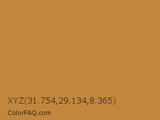XYZ 31.754,29.134,8.365 Color is a normal orange color and the nearest color is Peru #cd853f. Hex code #c2873d and RGB value is rgb(194,135,61). In RGB color space, this color is composed of 76% red, 53% green, 24% blue, In CMYK color space, this color is composed of 0% cyan, 30% magenta, 69% yellow , 24% black , In HSL color space, this color has a hue angle of 33° , 52% saturation and 50% lightness.