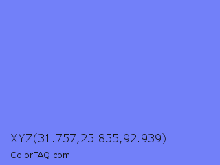 XYZ 31.757,25.855,92.939 Color is a light blue color and the nearest color is Medium Slate Blue #7b68ee. Hex code #7280f9 and RGB value is rgb(114,128,249). In RGB color space, this color is composed of 45% red, 50% green, 98% blue, In CMYK color space, this color is composed of 54% cyan, 49% magenta, 0% yellow , 2% black , In HSL color space, this color has a hue angle of 234° , 92% saturation and 71% lightness.