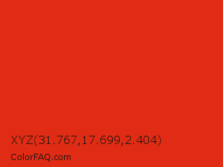XYZ 31.767,17.699,2.404 Color is a normal red color and the nearest color is Vermilion #d9381e. Hex code #e02c14 and RGB value is rgb(224,44,20). In RGB color space, this color is composed of 88% red, 17% green, 8% blue, In CMYK color space, this color is composed of 0% cyan, 80% magenta, 91% yellow , 12% black , In HSL color space, this color has a hue angle of 7° , 84% saturation and 48% lightness.