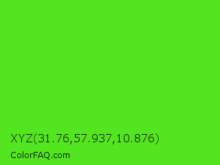 XYZ 31.76,57.937,10.876 Color is a normal green color and the nearest color is Harlequin Green #46cb18. Hex code #52e520 and RGB value is rgb(82,229,32). In RGB color space, this color is composed of 32% red, 90% green, 13% blue, In CMYK color space, this color is composed of 64% cyan, 0% magenta, 86% yellow , 10% black , In HSL color space, this color has a hue angle of 105° , 79% saturation and 51% lightness.