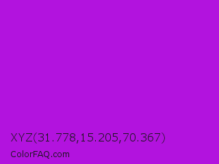 XYZ 31.778,15.205,70.367 Color is a normal purple color and the nearest color is Vivid Mulberry #b80ce3. Hex code #b213de and RGB value is rgb(178,19,222). In RGB color space, this color is composed of 70% red, 7% green, 87% blue, In CMYK color space, this color is composed of 20% cyan, 91% magenta, 0% yellow , 13% black , In HSL color space, this color has a hue angle of 287° , 84% saturation and 47% lightness.