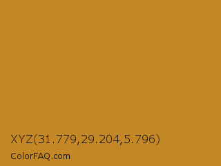 XYZ 31.779,29.204,5.796 Color is a normal orange color and the nearest color is Brandy Punch #cd8429. Hex code #c48726 and RGB value is rgb(196,135,38). In RGB color space, this color is composed of 77% red, 53% green, 15% blue, In CMYK color space, this color is composed of 0% cyan, 31% magenta, 81% yellow , 23% black , In HSL color space, this color has a hue angle of 37° , 68% saturation and 46% lightness.
