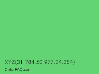 XYZ 31.784,50.977,24.384 Color is a light green color and the nearest color is Pastel Green #77dd77. Hex code #63d473 and RGB value is rgb(99,212,115). In RGB color space, this color is composed of 39% red, 83% green, 45% blue, In CMYK color space, this color is composed of 53% cyan, 0% magenta, 46% yellow , 17% black , In HSL color space, this color has a hue angle of 128° , 57% saturation and 61% lightness.