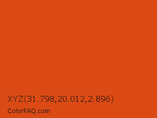 XYZ 31.798,20.012,2.896 Color is a normal orange color and the nearest color is Vermilion #d9381e. Hex code #db4a15 and RGB value is rgb(219,74,21). In RGB color space, this color is composed of 86% red, 29% green, 8% blue, In CMYK color space, this color is composed of 0% cyan, 66% magenta, 90% yellow , 14% black , In HSL color space, this color has a hue angle of 16° , 83% saturation and 47% lightness.