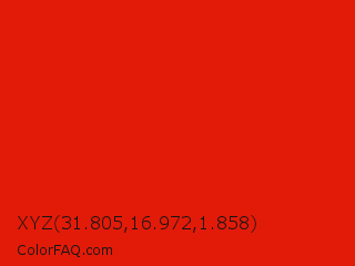 XYZ 31.805,16.972,1.858 Color is a normal red color and the nearest color is Lust #e62020. Hex code #e21b09 and RGB value is rgb(226,27,9). In RGB color space, this color is composed of 89% red, 11% green, 4% blue, In CMYK color space, this color is composed of 0% cyan, 88% magenta, 96% yellow , 11% black , In HSL color space, this color has a hue angle of 5° , 92% saturation and 46% lightness.