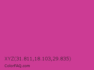 XYZ 31.811,18.103,29.835 Color is a normal magenta color and the nearest color is Magenta Pink #cc338b. Hex code #cc3b94 and RGB value is rgb(204,59,148). In RGB color space, this color is composed of 80% red, 23% green, 58% blue, In CMYK color space, this color is composed of 0% cyan, 71% magenta, 27% yellow , 20% black , In HSL color space, this color has a hue angle of 323° , 59% saturation and 52% lightness.