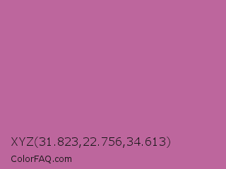 XYZ 31.823,22.756,34.613 Color is a normal magenta color and the nearest color is Pearly Purple #b768a2. Hex code #bd669d and RGB value is rgb(189,102,157). In RGB color space, this color is composed of 74% red, 40% green, 62% blue, In CMYK color space, this color is composed of 0% cyan, 46% magenta, 17% yellow , 26% black , In HSL color space, this color has a hue angle of 322° , 40% saturation and 57% lightness.