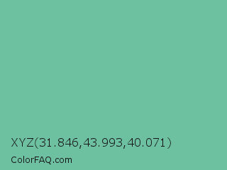 XYZ 31.846,43.993,40.071 Color is a normal green color and the nearest color is Green Sheen #6eaea1. Hex code #6ec1a0 and RGB value is rgb(110,193,160). In RGB color space, this color is composed of 43% red, 76% green, 63% blue, In CMYK color space, this color is composed of 43% cyan, 0% magenta, 17% yellow , 24% black , In HSL color space, this color has a hue angle of 156° , 40% saturation and 59% lightness.
