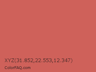 XYZ 31.852,22.553,12.347 Color is a normal red color and the nearest color is Chestnut Rose #cd5c5c. Hex code #cf615a and RGB value is rgb(207,97,90). In RGB color space, this color is composed of 81% red, 38% green, 35% blue, In CMYK color space, this color is composed of 0% cyan, 53% magenta, 57% yellow , 19% black , In HSL color space, this color has a hue angle of 4° , 55% saturation and 58% lightness.