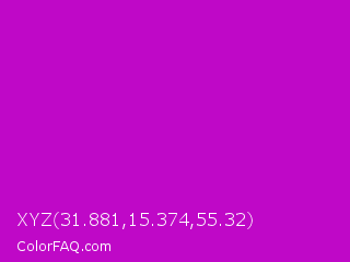 XYZ 31.881,15.374,55.32 Color is a normal magenta color and the nearest color is Deep Magenta #cc00cc. Hex code #bf08c7 and RGB value is rgb(191,8,199). In RGB color space, this color is composed of 75% red, 3% green, 78% blue, In CMYK color space, this color is composed of 4% cyan, 96% magenta, 0% yellow , 22% black , In HSL color space, this color has a hue angle of 297° , 92% saturation and 41% lightness.