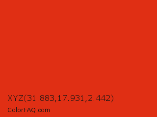 XYZ 31.883,17.931,2.442 Color is a normal red color and the nearest color is Vermilion #d9381e. Hex code #e02f14 and RGB value is rgb(224,47,20). In RGB color space, this color is composed of 88% red, 18% green, 8% blue, In CMYK color space, this color is composed of 0% cyan, 79% magenta, 91% yellow , 12% black , In HSL color space, this color has a hue angle of 8° , 84% saturation and 48% lightness.