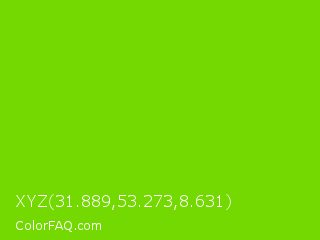 XYZ 31.889,53.273,8.631 Color is a normal green color and the nearest color is Alien Armpit #84de02. Hex code #73d901 and RGB value is rgb(115,217,1). In RGB color space, this color is composed of 45% red, 85% green, 0% blue, In CMYK color space, this color is composed of 47% cyan, 0% magenta, 100% yellow , 15% black , In HSL color space, this color has a hue angle of 88° , 99% saturation and 43% lightness.