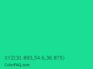 XYZ 31.893,54.6,36.875 Color is a normal green color and the nearest color is Shamrock #33cc99. Hex code #1ade94 and RGB value is rgb(26,222,148). In RGB color space, this color is composed of 10% red, 87% green, 58% blue, In CMYK color space, this color is composed of 88% cyan, 0% magenta, 33% yellow , 13% black , In HSL color space, this color has a hue angle of 157° , 79% saturation and 49% lightness.