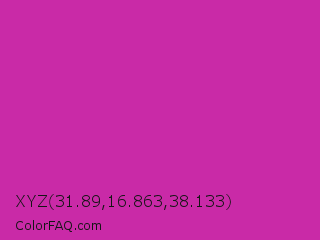 XYZ 31.89,16.863,38.133 Color is a normal magenta color and the nearest color is Byzantine #bd33a4. Hex code #c92aa7 and RGB value is rgb(201,42,167). In RGB color space, this color is composed of 79% red, 16% green, 65% blue, In CMYK color space, this color is composed of 0% cyan, 79% magenta, 17% yellow , 21% black , In HSL color space, this color has a hue angle of 313° , 65% saturation and 48% lightness.
