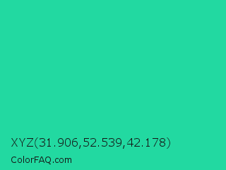 XYZ 31.906,52.539,42.178 Color is a normal green color and the nearest color is Shamrock #33cc99. Hex code #22d9a1 and RGB value is rgb(34,217,161). In RGB color space, this color is composed of 13% red, 85% green, 63% blue, In CMYK color space, this color is composed of 84% cyan, 0% magenta, 26% yellow , 15% black , In HSL color space, this color has a hue angle of 162° , 73% saturation and 49% lightness.