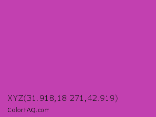 XYZ 31.918,18.271,42.919 Color is a normal magenta color and the nearest color is Byzantine #bd33a4. Hex code #c240b0 and RGB value is rgb(194,64,176). In RGB color space, this color is composed of 76% red, 25% green, 69% blue, In CMYK color space, this color is composed of 0% cyan, 67% magenta, 9% yellow , 24% black , In HSL color space, this color has a hue angle of 308° , 52% saturation and 51% lightness.