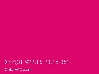 XYZ 31.922,16.23,15.36 Color is a normal rose color and the nearest color is Red Purple #e40078. Hex code #db056b and RGB value is rgb(219,5,107). In RGB color space, this color is composed of 86% red, 2% green, 42% blue, In CMYK color space, this color is composed of 0% cyan, 98% magenta, 51% yellow , 14% black , In HSL color space, this color has a hue angle of 331° , 96% saturation and 44% lightness.