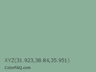 XYZ 31.923,38.84,35.951 Color is a light green color and the nearest color is Morning Blue #8da399. Hex code #8bb099 and RGB value is rgb(139,176,153). In RGB color space, this color is composed of 55% red, 69% green, 60% blue, In CMYK color space, this color is composed of 21% cyan, 0% magenta, 13% yellow , 31% black , In HSL color space, this color has a hue angle of 143° , 19% saturation and 62% lightness.