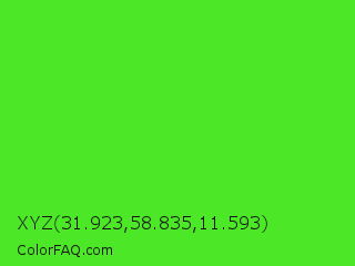 XYZ 31.923,58.835,11.593 Color is a normal green color and the nearest color is Harlequin Green #46cb18. Hex code #4ce727 and RGB value is rgb(76,231,39). In RGB color space, this color is composed of 30% red, 91% green, 15% blue, In CMYK color space, this color is composed of 67% cyan, 0% magenta, 83% yellow , 9% black , In HSL color space, this color has a hue angle of 108° , 80% saturation and 53% lightness.