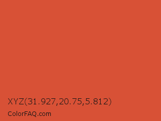 XYZ 31.927,20.75,5.812 Color is a normal red color and the nearest color is Flame Pea #da5b38. Hex code #d85136 and RGB value is rgb(216,81,54). In RGB color space, this color is composed of 85% red, 32% green, 21% blue, In CMYK color space, this color is composed of 0% cyan, 63% magenta, 75% yellow , 15% black , In HSL color space, this color has a hue angle of 10° , 68% saturation and 53% lightness.
