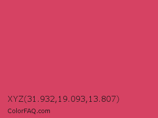 XYZ 31.932,19.093,13.807 Color is a normal red color and the nearest color is Paradise Pink #e63e62. Hex code #d64263 and RGB value is rgb(214,66,99). In RGB color space, this color is composed of 84% red, 26% green, 39% blue, In CMYK color space, this color is composed of 0% cyan, 69% magenta, 54% yellow , 16% black , In HSL color space, this color has a hue angle of 347° , 64% saturation and 55% lightness.