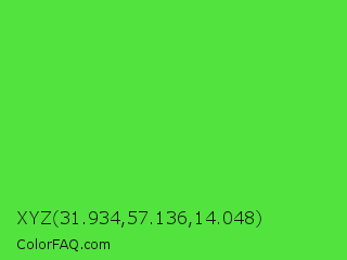 XYZ 31.934,57.136,14.048 Color is a normal green color and the nearest color is Lime Green #32cd32. Hex code #53e33f and RGB value is rgb(83,227,63). In RGB color space, this color is composed of 33% red, 89% green, 25% blue, In CMYK color space, this color is composed of 63% cyan, 0% magenta, 72% yellow , 11% black , In HSL color space, this color has a hue angle of 113° , 75% saturation and 57% lightness.