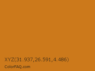 XYZ 31.937,26.591,4.486 Color is a normal orange color and the nearest color is Ochre #cc7722. Hex code #cc791b and RGB value is rgb(204,121,27). In RGB color space, this color is composed of 80% red, 47% green, 11% blue, In CMYK color space, this color is composed of 0% cyan, 41% magenta, 87% yellow , 20% black , In HSL color space, this color has a hue angle of 32° , 77% saturation and 45% lightness.