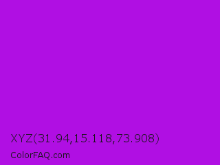 XYZ 31.94,15.118,73.908 Color is a normal purple color and the nearest color is Vivid Mulberry #b80ce3. Hex code #b00fe3 and RGB value is rgb(176,15,227). In RGB color space, this color is composed of 69% red, 6% green, 89% blue, In CMYK color space, this color is composed of 22% cyan, 93% magenta, 0% yellow , 11% black , In HSL color space, this color has a hue angle of 286° , 88% saturation and 47% lightness.
