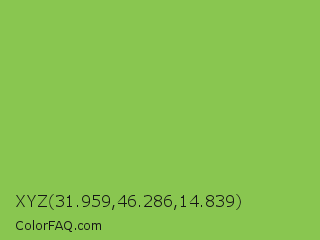 XYZ 31.959,46.286,14.839 Color is a normal green color and the nearest color is Dollar Bill #85bb65. Hex code #89c650 and RGB value is rgb(137,198,80). In RGB color space, this color is composed of 54% red, 78% green, 31% blue, In CMYK color space, this color is composed of 31% cyan, 0% magenta, 60% yellow , 22% black , In HSL color space, this color has a hue angle of 91° , 51% saturation and 55% lightness.