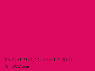 XYZ 31.971,16.372,12.302 Color is a normal rose color and the nearest color is Raspberry #e30b5d. Hex code #dd085f and RGB value is rgb(221,8,95). In RGB color space, this color is composed of 87% red, 3% green, 37% blue, In CMYK color space, this color is composed of 0% cyan, 96% magenta, 57% yellow , 13% black , In HSL color space, this color has a hue angle of 335° , 93% saturation and 45% lightness.